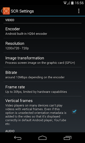 SCR Screen Recorder uses hardware accelerated video encoding to achieve best quality screen recording on any device. It's the only video recorder on the market supporting Tegra device including Nexus 7.